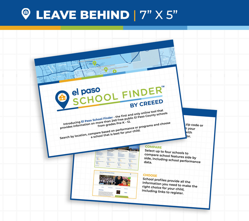 We worked with CREEED to design and develop the El Paso School Finder bilingual website. Parents and guardians have the ability to search for schools by location via zip code or address and by type (district name, school level, grade level). Once in search mode, schools can be filtered down by additional criteria such as school programs and features. Each school has an individual profile with detailed information on ratings/metrics, features, and demographics.